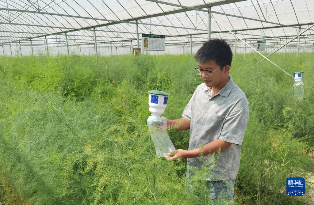 9月4日,在江西省南昌市石埠鎮西崗村“夢(mèng)飛田園”蘆筍產(chǎn)業(yè)示范區種植基地,從江西交通職業(yè)技術(shù)學(xué)院畢業(yè)后回到鄉村創(chuàng )業(yè)成立電商公司的羅文軒在大棚里檢查防蟲(chóng)設施。