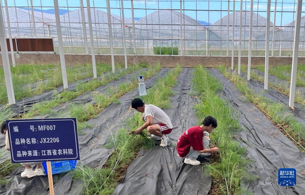 9月2日,在江西省南昌市石埠鎮西崗村“夢(mèng)飛田園”蘆筍產(chǎn)業(yè)示范區種植基地,來(lái)自江西省交通高級技工學(xué)校的實(shí)習學(xué)生在大棚里體驗蘆筍種植。