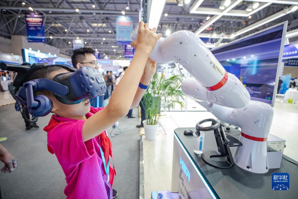 9月4日,在2023智博會(huì )華數機器人展廳,觀(guān)眾體驗工業(yè)協(xié)作機器人。