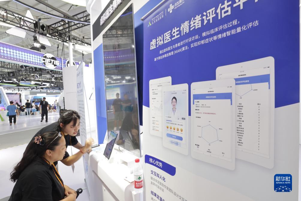 9月4日,在首鋼園健康衛生服務(wù)專(zhuān)題展區,工作人員在北京安定醫院展臺講解虛擬醫生情緒評估平臺。