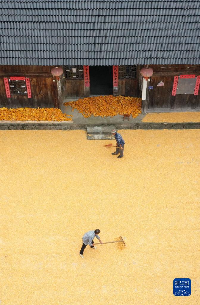 9月3日,村民在貴州省福泉市陸坪鎮福興村院壩晾曬玉米(無(wú)人機照片)。