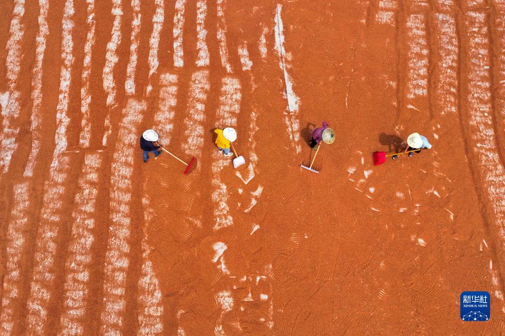 9月4日,村民在貴州省黔東南苗族侗族自治州岑鞏縣天馬鎮白巖坪村晾曬高粱(無(wú)人機照片)。