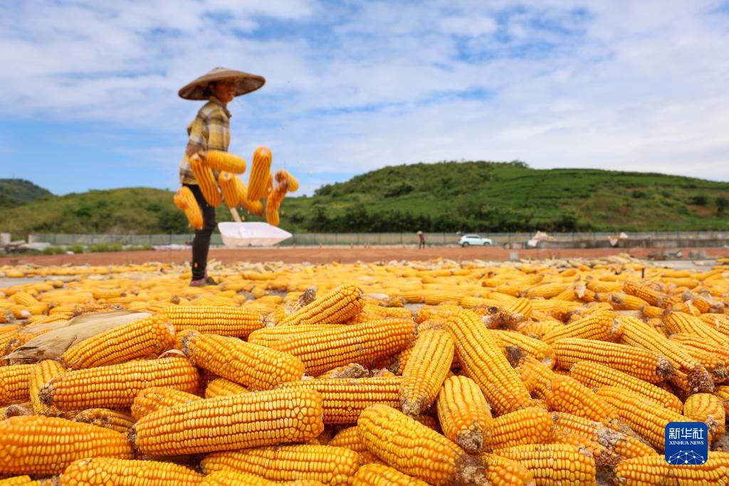 9月4日,村民在貴州省黔東南苗族侗族自治州岑鞏縣天馬鎮白巖坪村晾曬玉米。