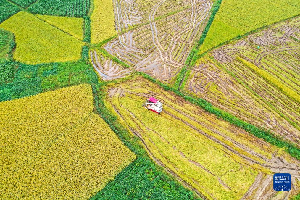 9月4日,湖南省常寧市洋泉鎮四泉村村民駕駛收割機收割水稻(無(wú)人機照片)。