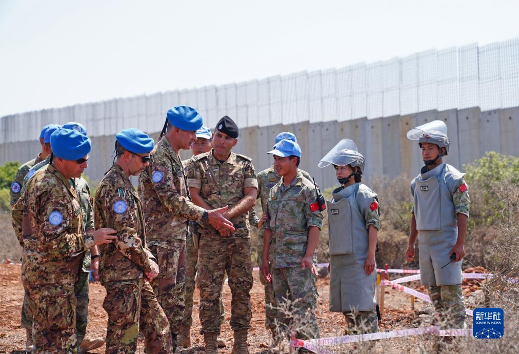 9月4日,在黎巴嫩南部“藍線(xiàn)”附近雷場(chǎng),聯(lián)合國駐黎巴嫩臨時(shí)部隊(聯(lián)黎部隊)西區司令喬瓦尼·布拉法準將(左三)與中國第21批赴黎維和部隊掃雷官兵交流。