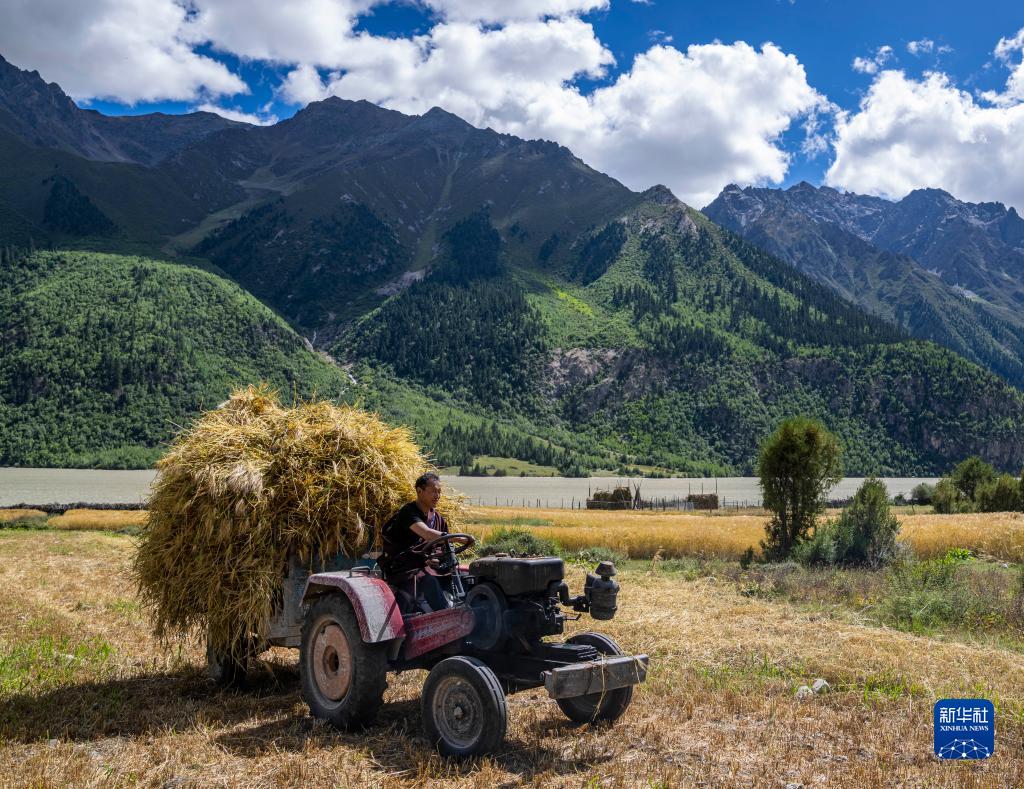 西藏昌都市八宿縣然烏鎮瓦巴村村民開(kāi)著(zhù)拖拉機運送剛收割完的青稞(9月4日攝)。
