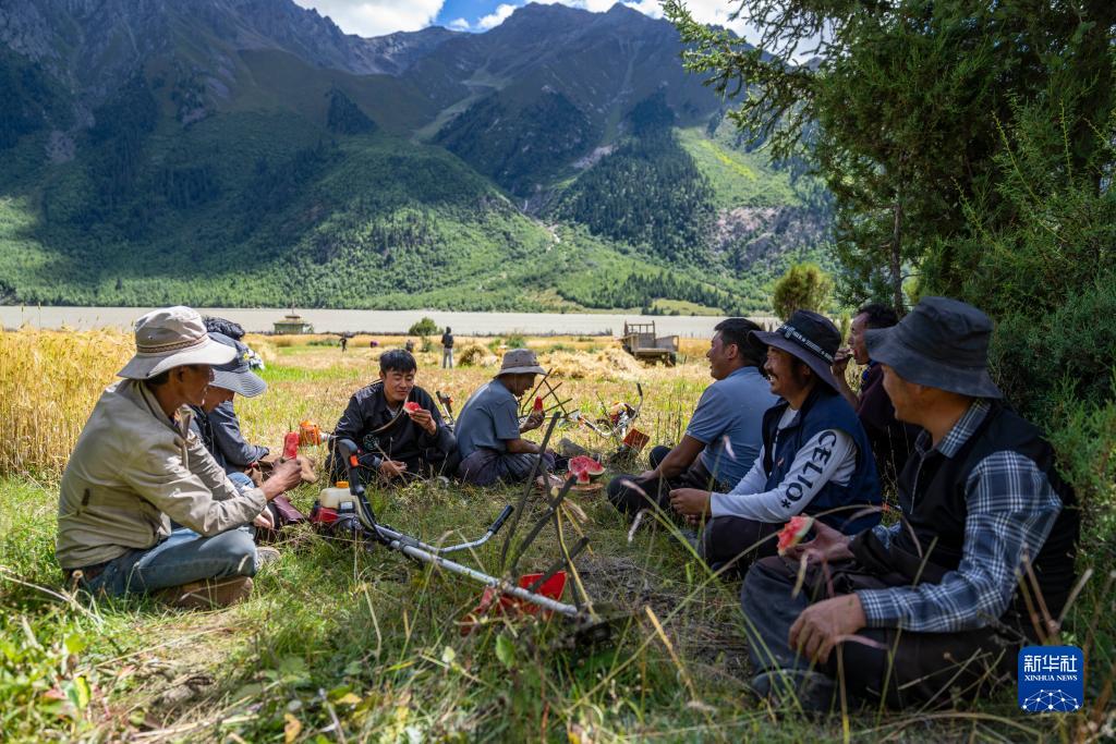西藏昌都市八宿縣然烏鎮瓦巴村村民在秋收間隙乘涼休息(9月4日攝)。