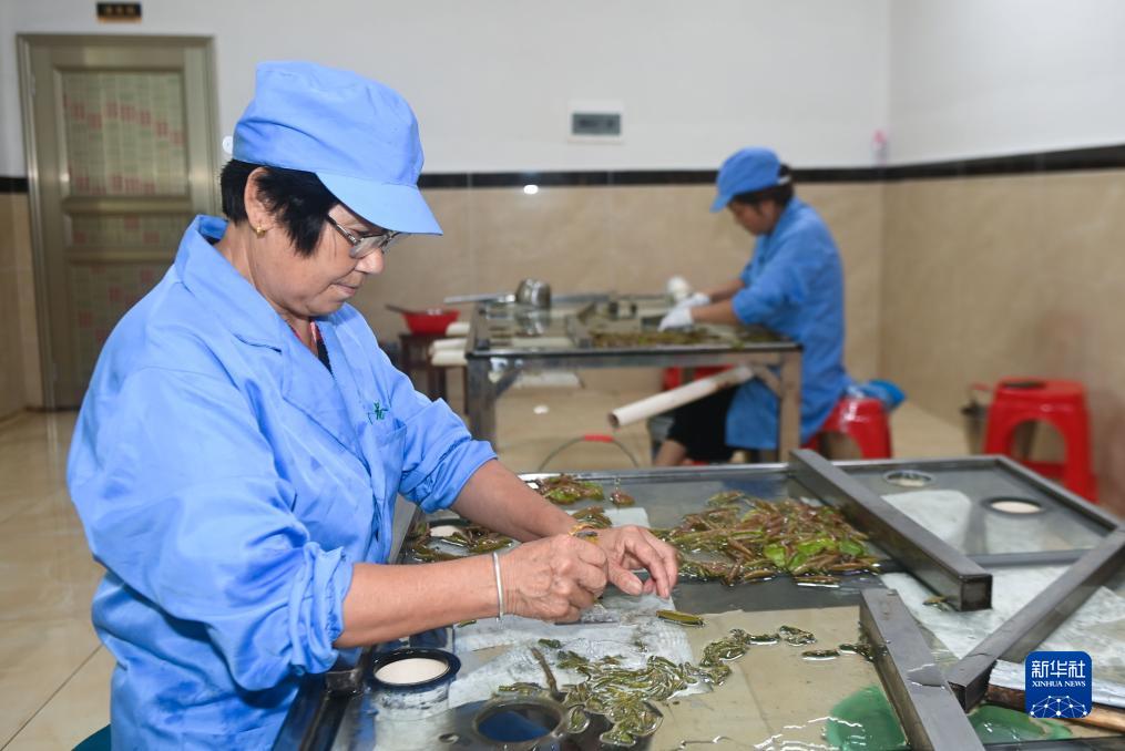 9月5日,在建德市航頭鎮烏龍村西湖莼菜產(chǎn)業(yè)園的車(chē)間內,工人在分揀剛剛采摘的莼菜。