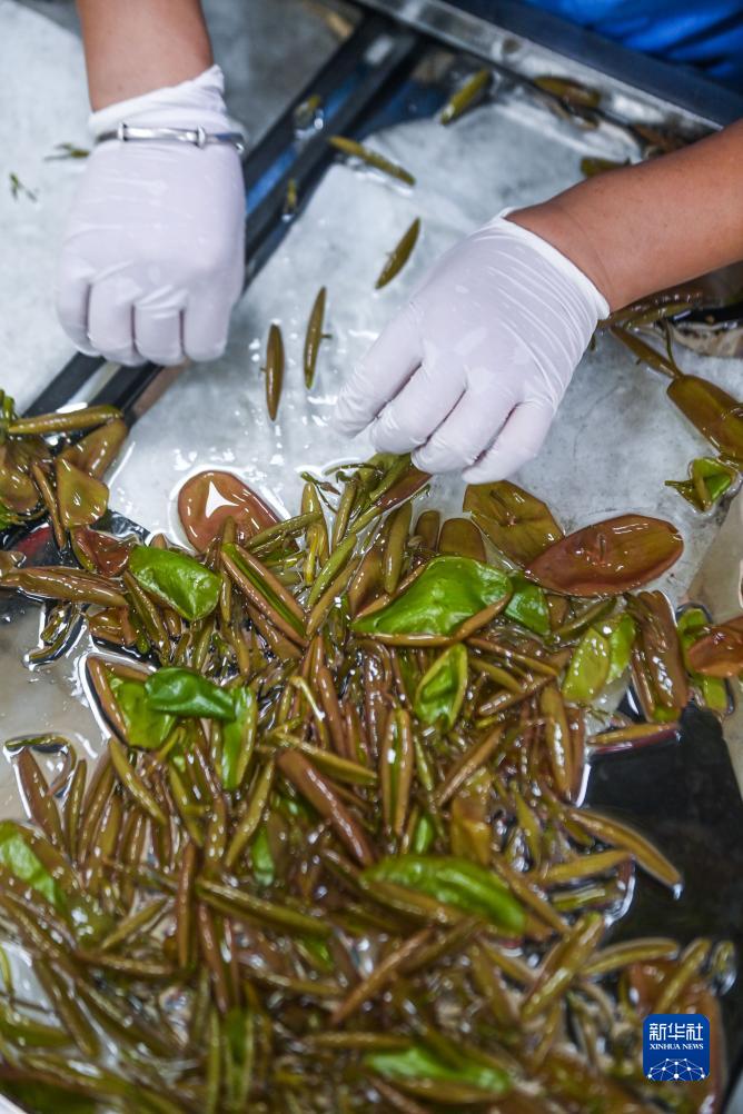 9月5日,在建德市航頭鎮烏龍村西湖莼菜產(chǎn)業(yè)園的車(chē)間內,工人在分揀剛剛采摘的莼菜。