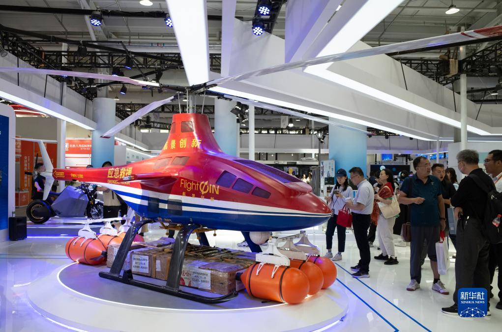 9月5日,觀(guān)眾在服貿會(huì )首鋼園區的中關(guān)村科技園房山園展臺了解一款無(wú)人直升機。