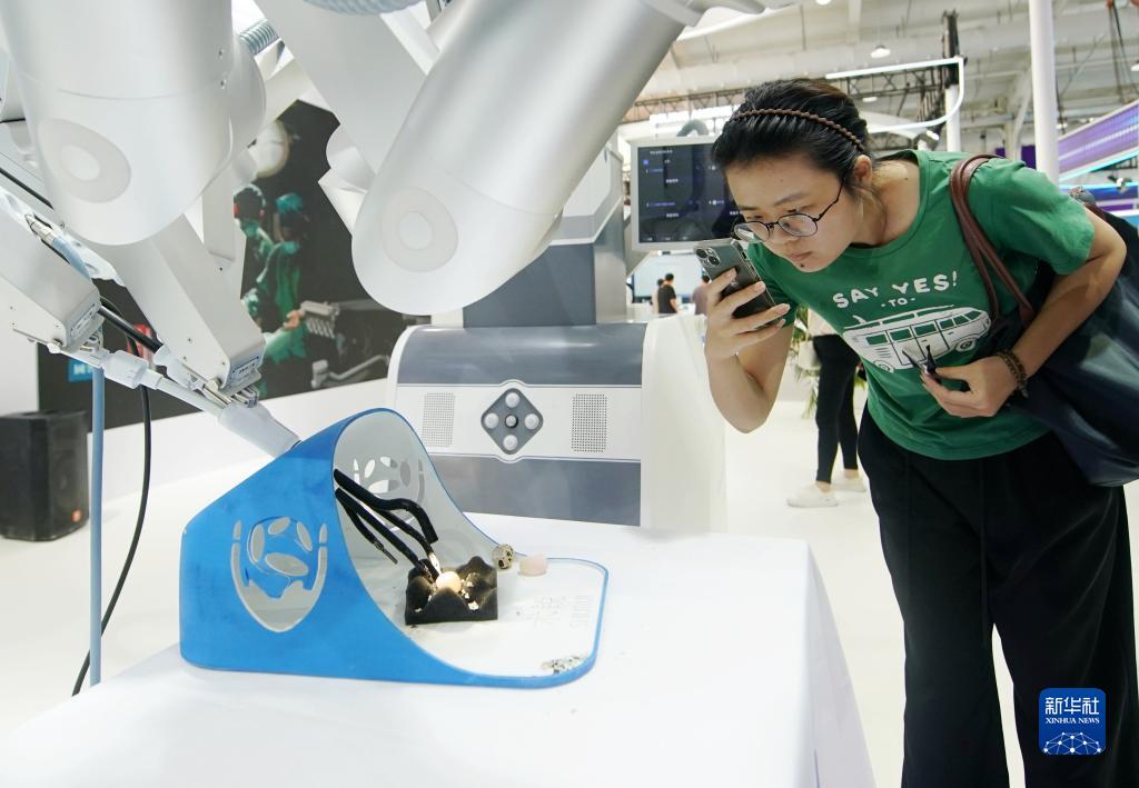 9月5日,參觀(guān)者在服貿會(huì )首鋼園區的健康衛生服務(wù)專(zhuān)題展內觀(guān)看單孔腔鏡手術(shù)機器人展示。