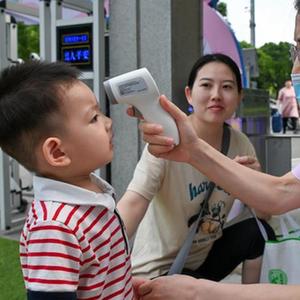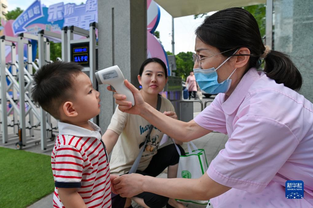 9月5日,托育園的工作人員在幫入園的小朋友測量體溫。