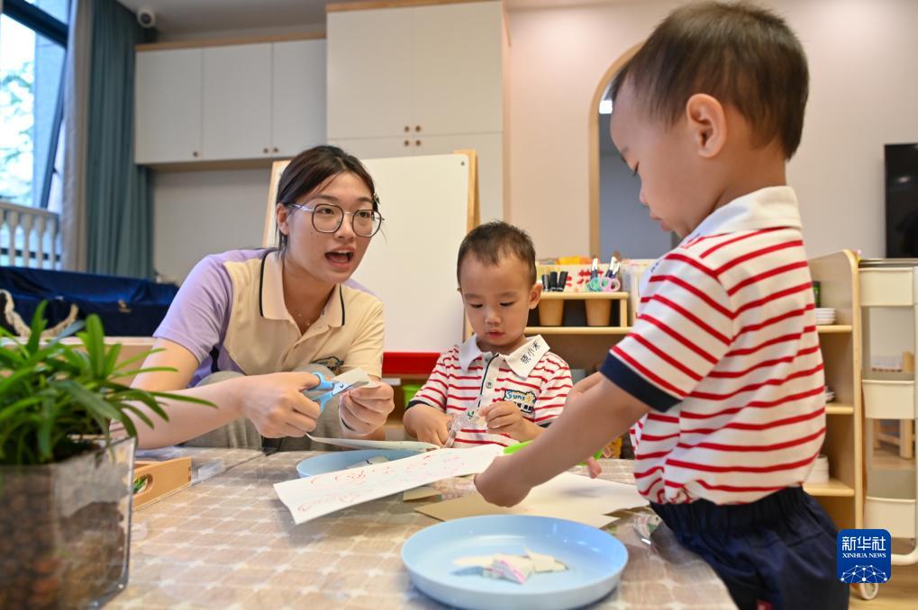 小朋友在托育老師的陪伴下玩樂(lè )(9月4日攝)。