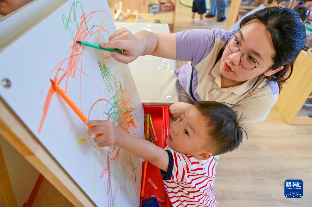 一名小朋友在托育老師的陪伴下畫(huà)畫(huà)(9月4日攝)。
