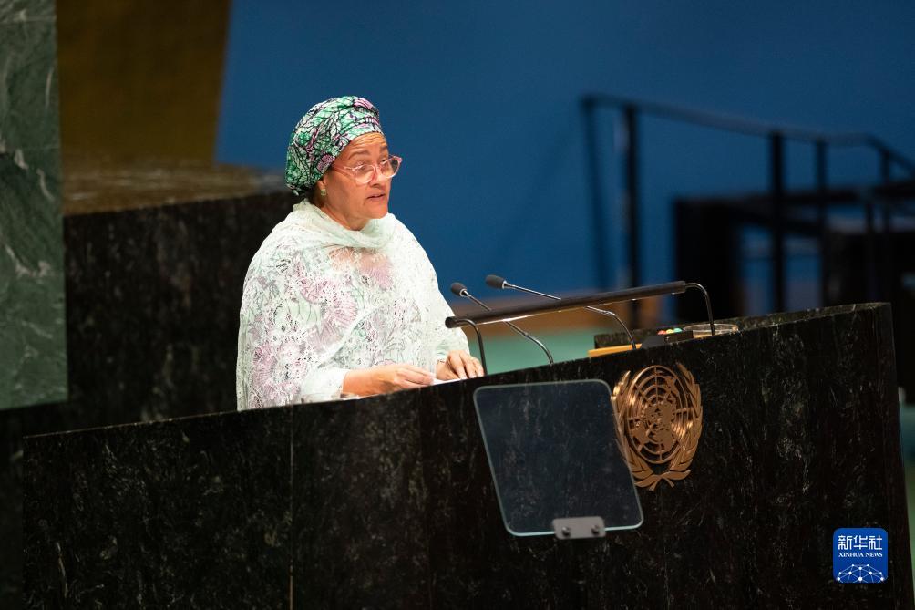 9月5日,在位于紐約的聯(lián)合國總部,聯(lián)合國常務(wù)副秘書(shū)長(cháng)阿明娜·穆罕默德代表聯(lián)合國秘書(shū)長(cháng)古特雷斯在第78屆聯(lián)合國大會(huì )第一次全會(huì )上致辭。