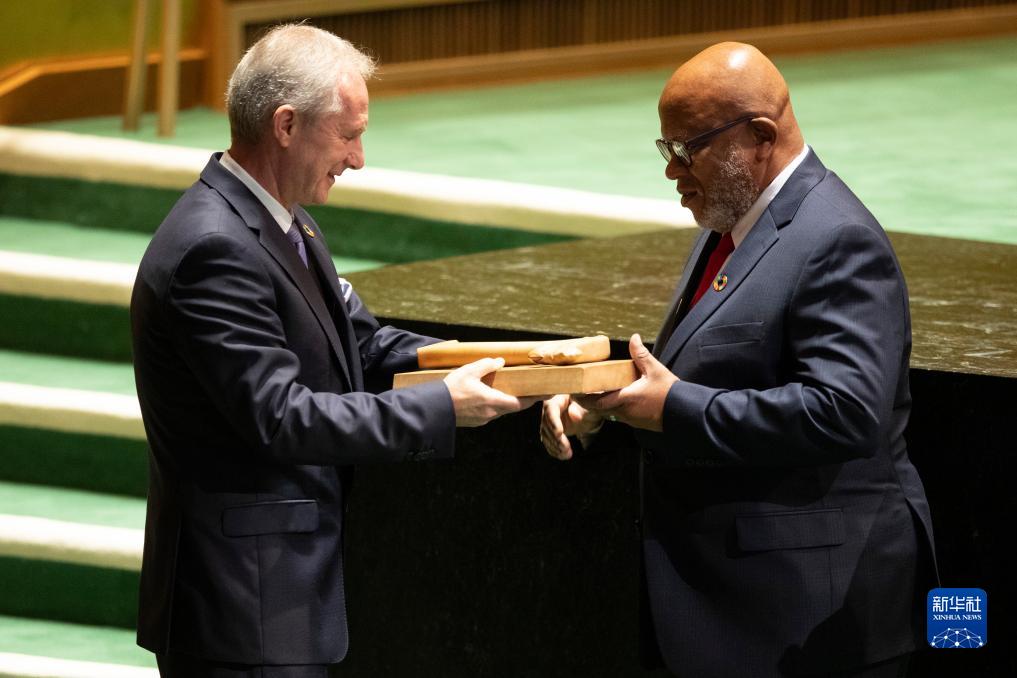 9月5日,在位于紐約的聯(lián)合國總部,第78屆聯(lián)合國大會(huì )主席丹尼斯·弗朗西斯(右)從第77屆聯(lián)合國大會(huì )主席克勒希手中接過(guò)象征聯(lián)大主席權力的木槌。