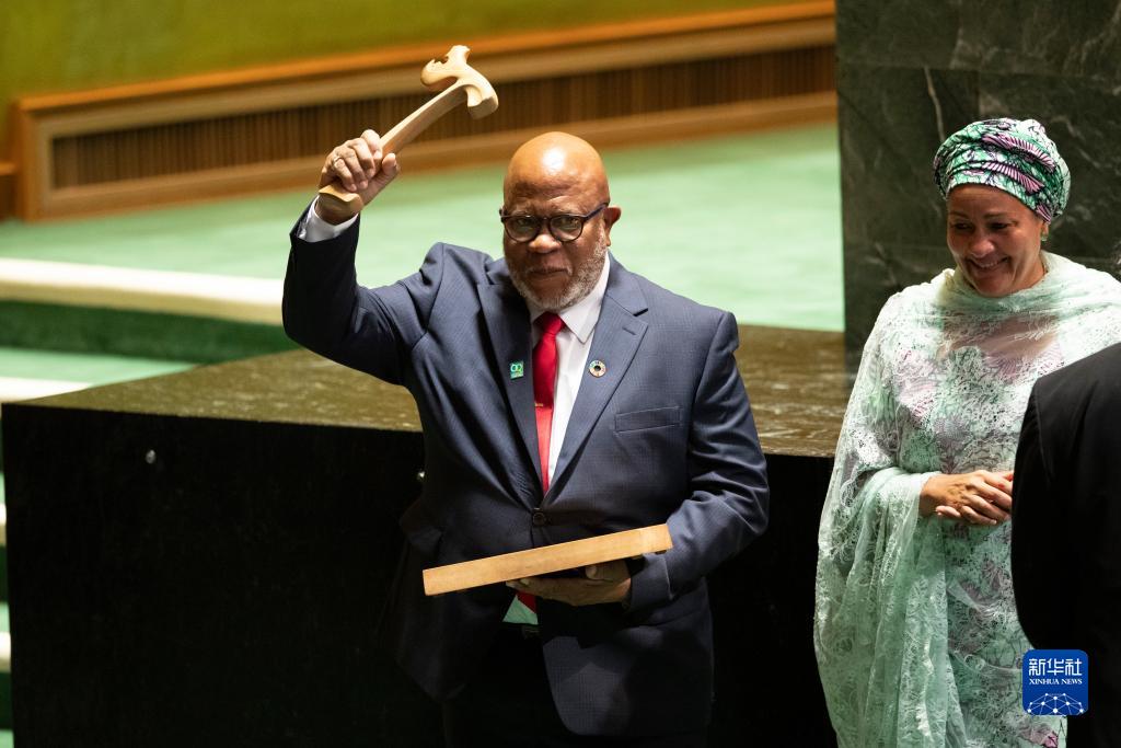 9月5日,在位于紐約的聯(lián)合國總部,第78屆聯(lián)合國大會(huì )主席丹尼斯·弗朗西斯(左)舉起象征聯(lián)大主席權力的木槌。