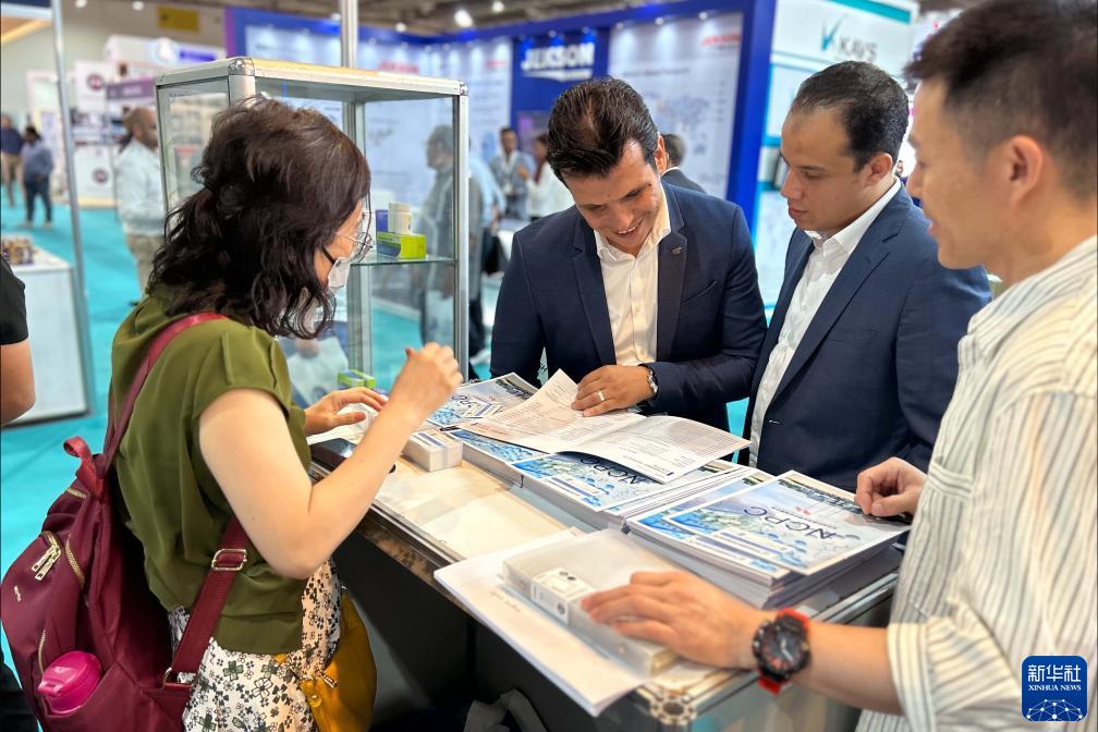 9月3日,在埃及開(kāi)羅舉辦的2023埃及醫藥展上,參觀(guān)者在一家中國醫藥企業(yè)的展位上了解信息。