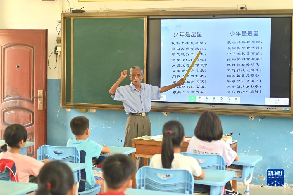 在梧州市長(cháng)洲區長(cháng)洲鎮泗洲小學(xué),陳明仲在教孩子們唱下俚歌(9月5日攝)。