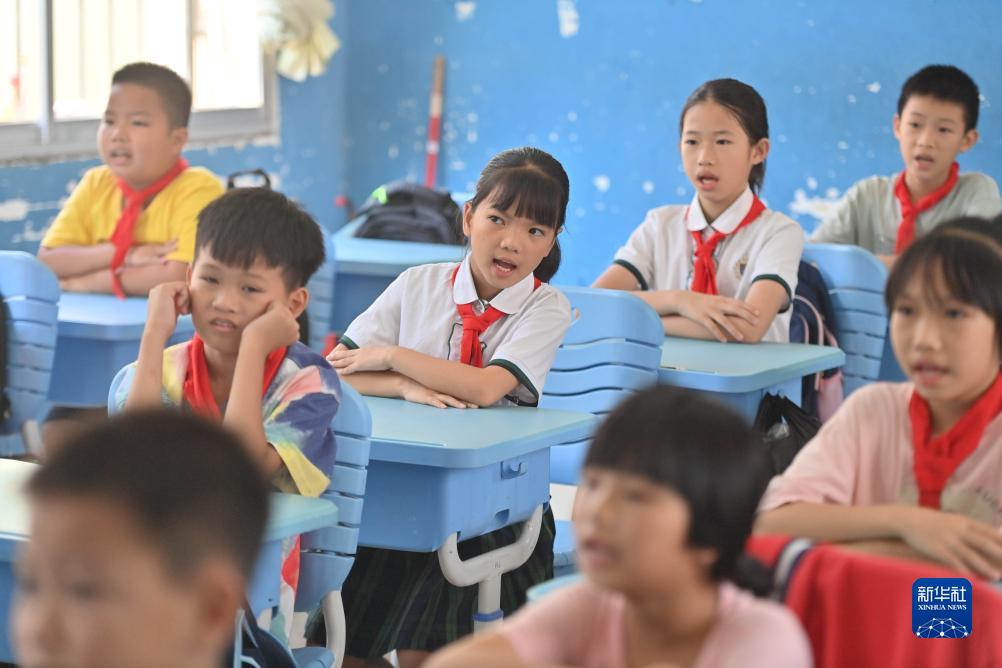 在梧州市長(cháng)洲區長(cháng)洲鎮泗洲小學(xué),孩子們在跟著(zhù)陳明仲學(xué)唱下俚歌(9月5日攝)。