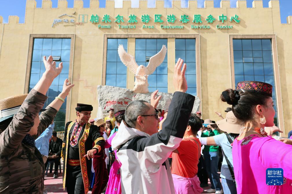 在新疆塔什庫爾干塔吉克自治縣帕米爾旅游區游客服務(wù)中心,縣文工團演員與游客共舞(9月4日攝)。