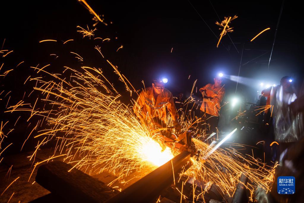 9月6日凌晨,在京廣高鐵株洲西至衡山西區間,鐵路工人使用切割機進(jìn)行鋸軌作業(yè)。