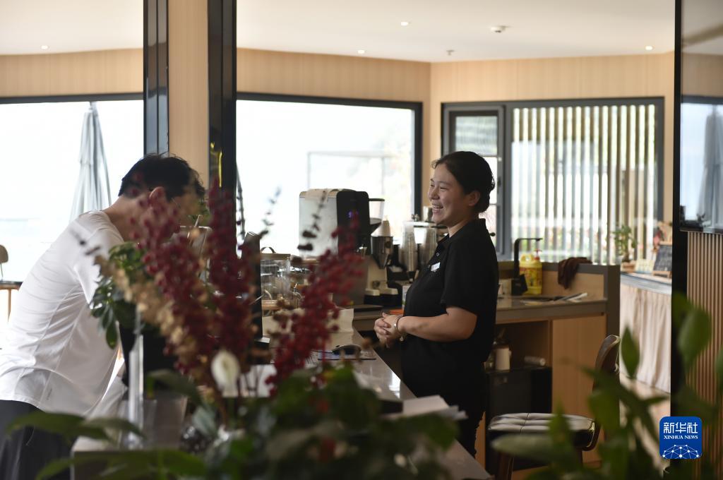 9月5日,林州市石板巖鎮一家“鄉村振興”公益項目民宿的工作人員(右)在接待來(lái)訪(fǎng)者。