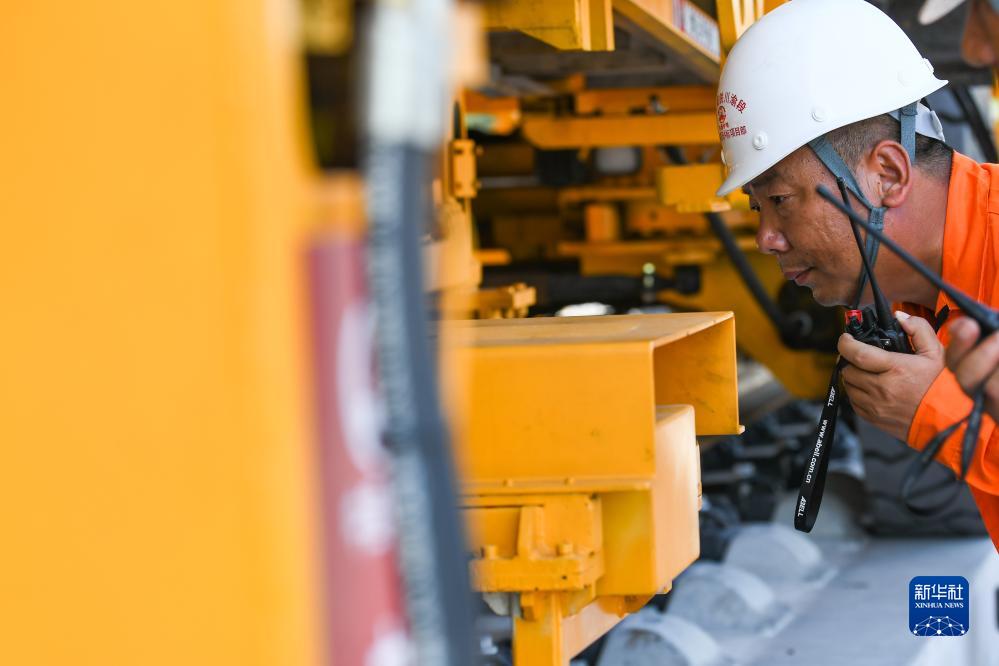 9月6日,在四川省瀘州市馮灣特大橋施工現場(chǎng),工人在進(jìn)行鋪軌施工。