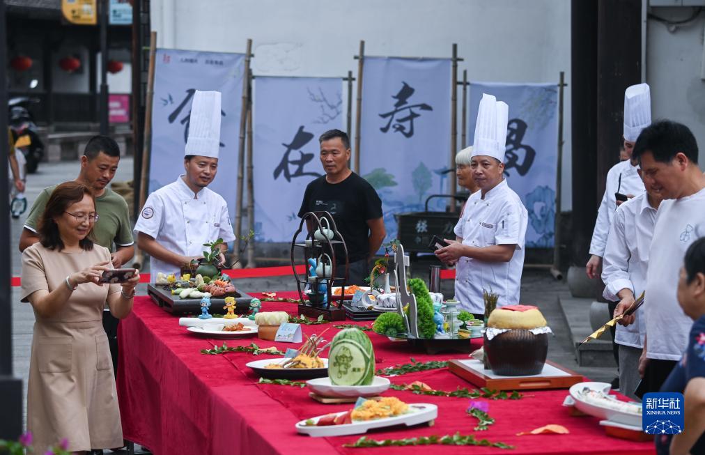 9月6日,在浙江省建德市壽昌古鎮開(kāi)幕的古鎮好吃節上,由建德市餐飲協(xié)會(huì )制作的“魚(yú)躍亞運”“騰龍飛天”“亞運定勝”“金牌滿(mǎn)堂”等多道亞運主題菜品在現場(chǎng)展示,吸引了眾多市民的眼球。