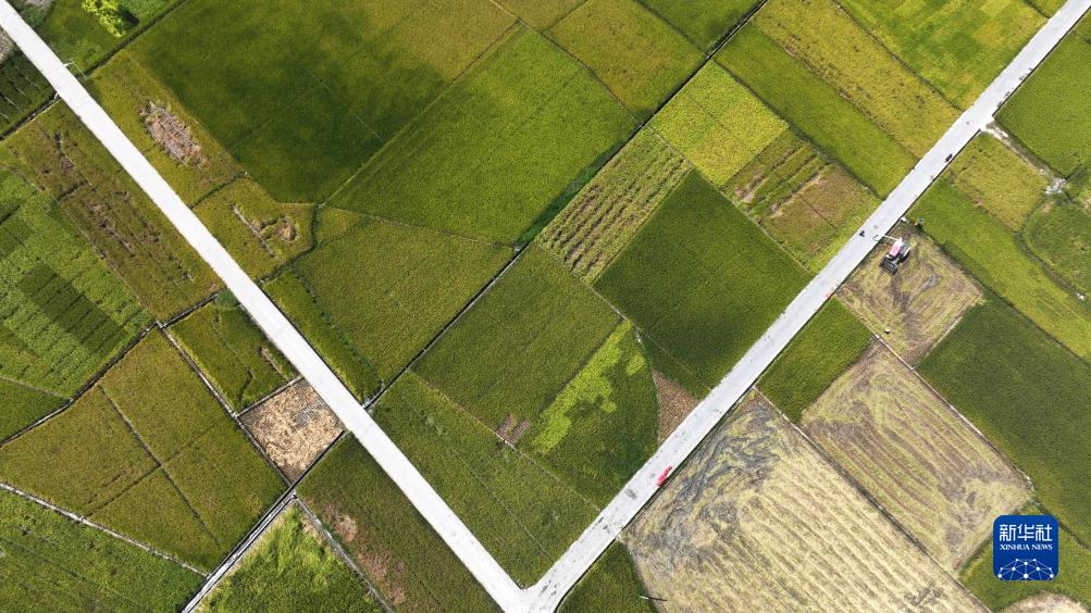 9月6日,村民在貴州省黔東南苗族侗族自治州黃平縣舊州鎮萬(wàn)畝大壩搶收稻谷(無(wú)人機照片)。