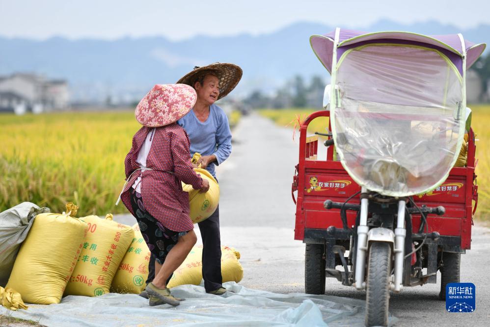 9月6日,村民在貴州省黔東南苗族侗族自治州黃平縣舊州鎮萬(wàn)畝大壩搬運剛收獲的稻谷。