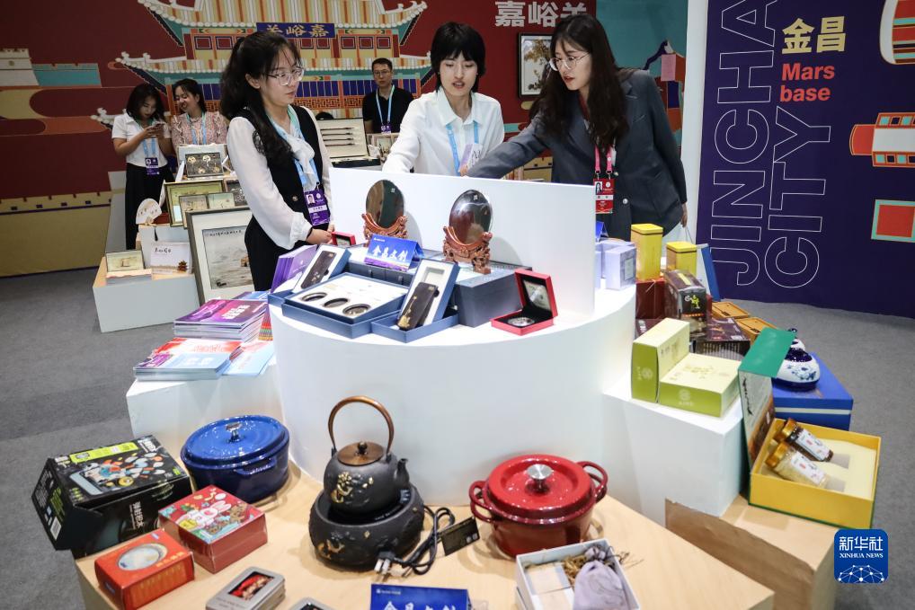 9月6日,與會(huì )嘉賓在第六屆絲綢之路(敦煌)國際文化博覽會(huì )上參觀(guān)文創(chuàng )產(chǎn)品和文旅裝備展銷(xiāo)活動(dòng)。
