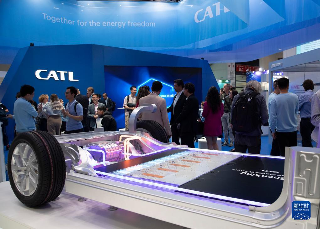 這是9月5日在德國慕尼黑國際車(chē)展的寧德時(shí)代展區拍攝的神行超充電池展品。