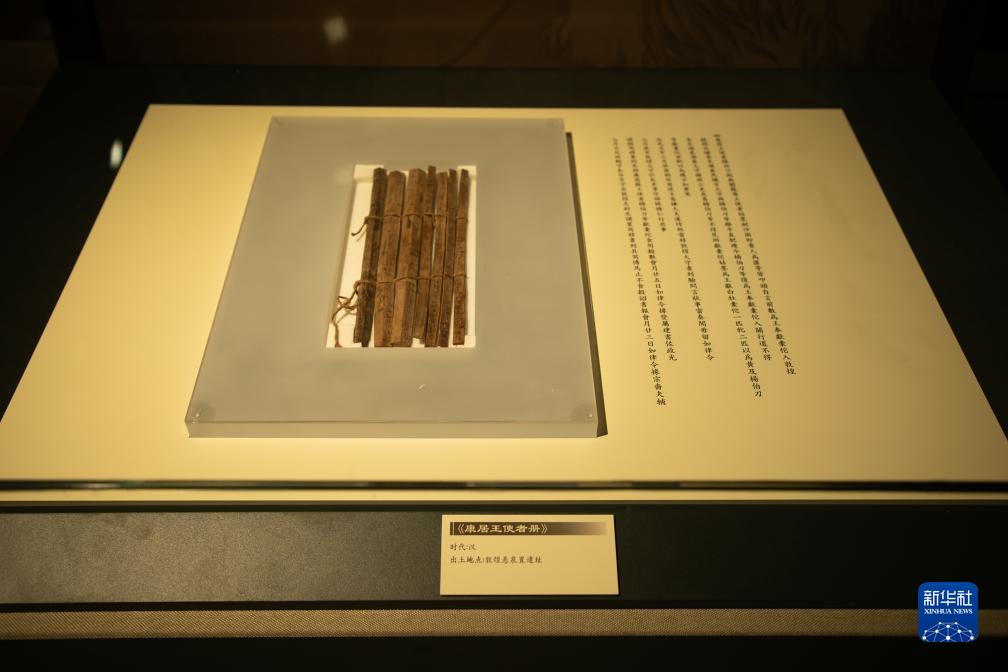 這是9月7日拍攝的甘肅簡(jiǎn)牘博物館展出的由7枚簡(jiǎn)牘組成的“康居王使者冊”。