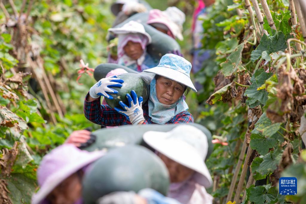 9月7日,農民在貴州省安順市西秀區舊州鎮浪塘村搬運采摘的冬瓜。