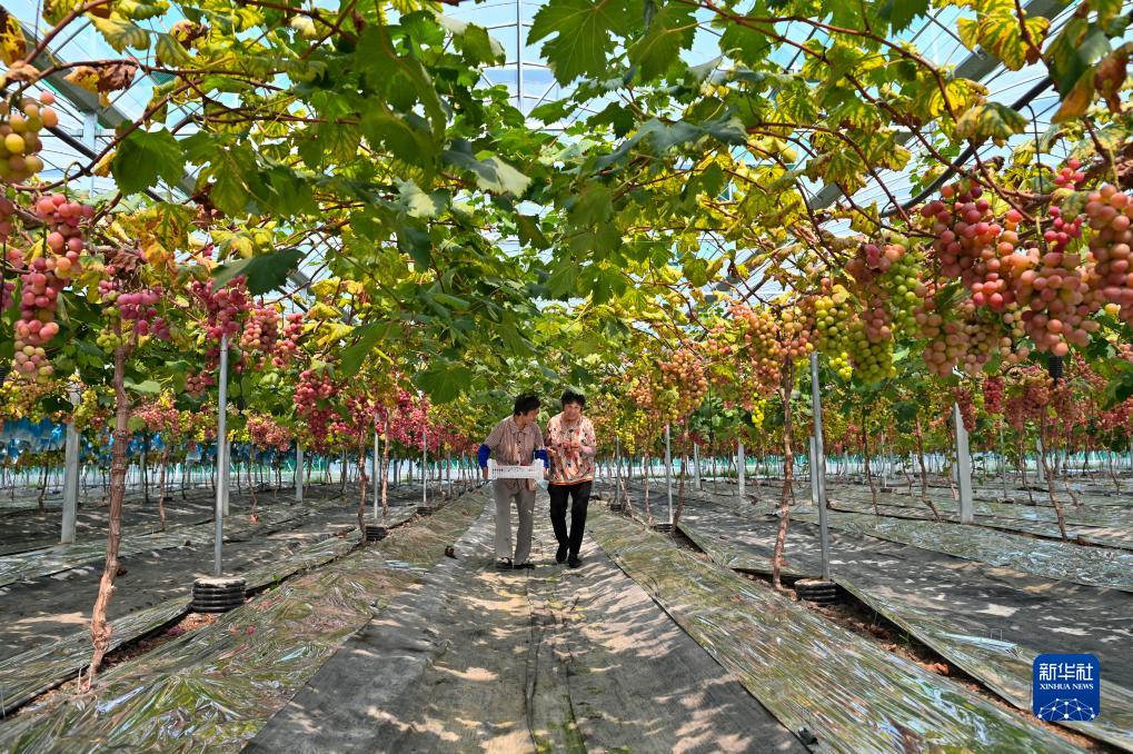 9月7日,在江蘇省鹽城市建湖縣一處葡萄園,農業(yè)工人在運輸剛采摘的葡萄。