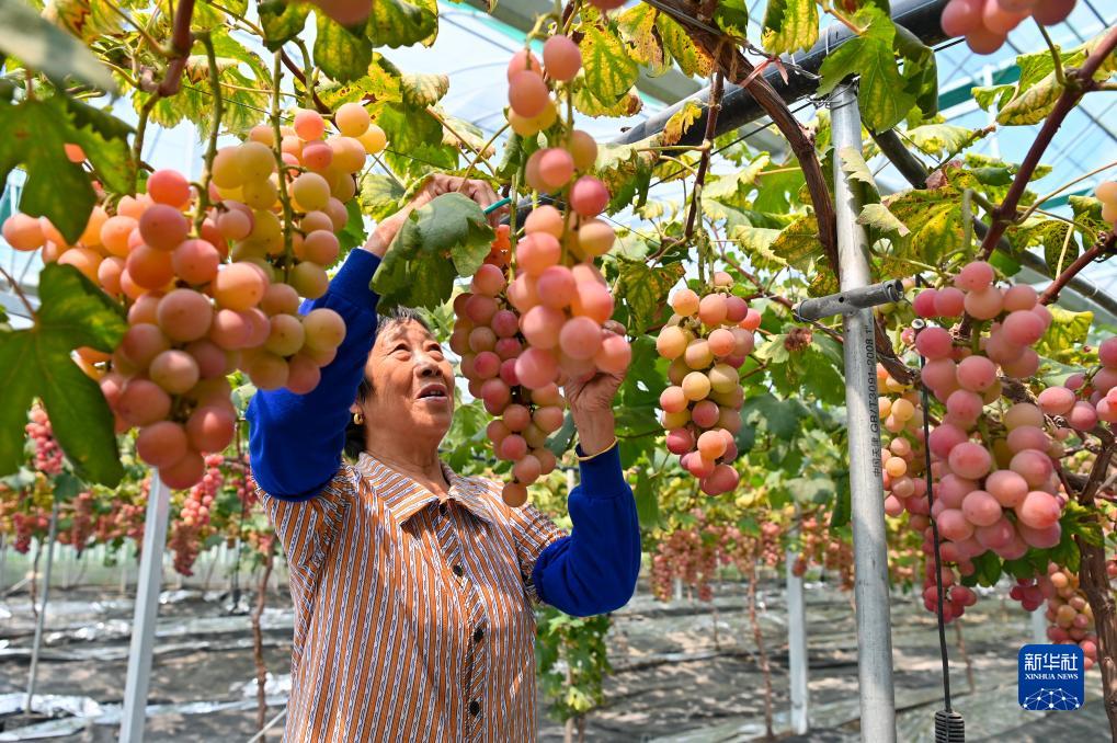 9月7日,在江蘇省鹽城市建湖縣一處葡萄園,農業(yè)工人在采摘葡萄。