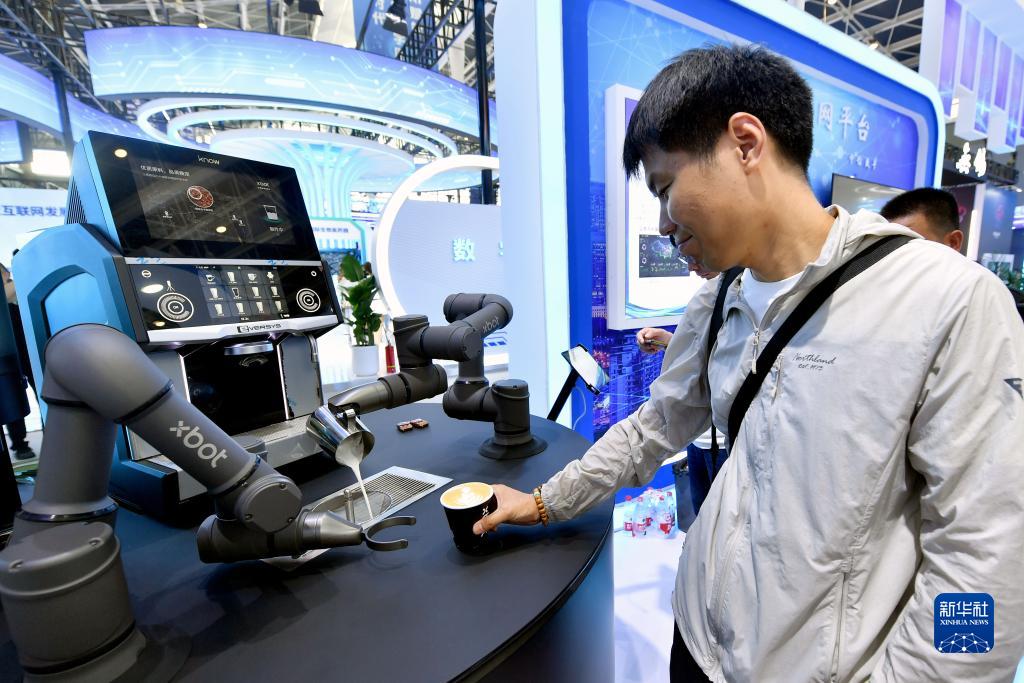 9月7日,參觀(guān)者在2023中國國際數字經(jīng)濟博覽會(huì )上體驗艾博咖啡機器人。