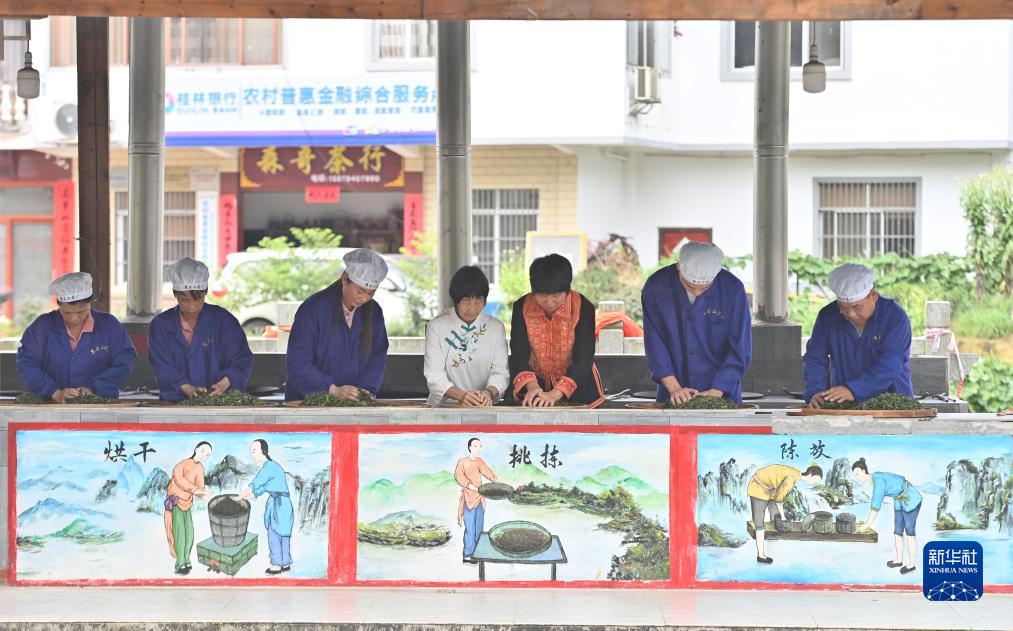 在梧州市蒼梧縣六堡鎮黑石山茶廠(chǎng),六堡茶制作技藝瑤族非遺傳承人祝雪蘭(右三)和漢族非遺傳承人韋潔群(右四)在交流制茶技藝(9月6日攝)。