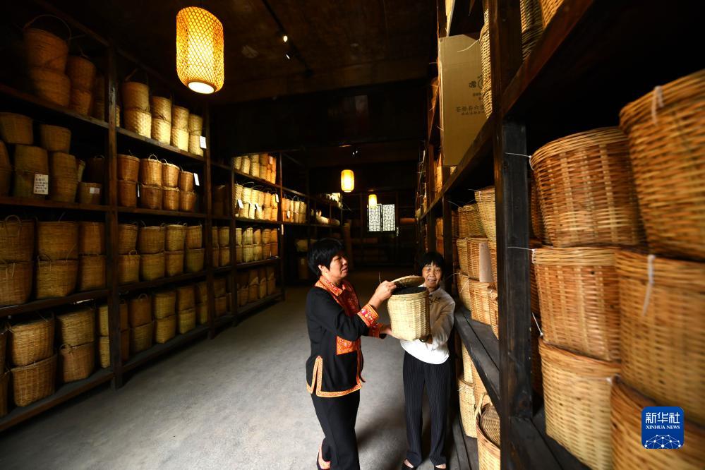 在梧州市蒼梧縣六堡鎮黑石山茶廠(chǎng),六堡茶制作技藝瑤族非遺傳承人祝雪蘭(左)和漢族非遺傳承人韋潔群在交流制茶經(jīng)驗(9月6日攝)。