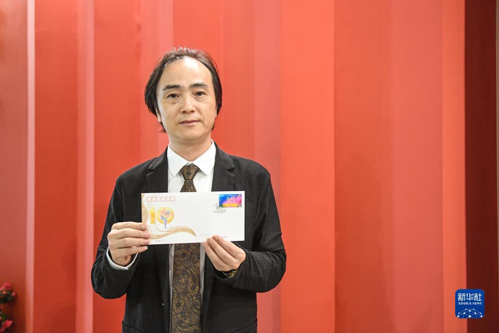 9月7日,“絲路金橋”景觀(guān)作品創(chuàng )作者舒勇向記者展示含有“絲路金橋”元素的《“一帶一路”倡議提出十周年》紀念郵票及首日封。