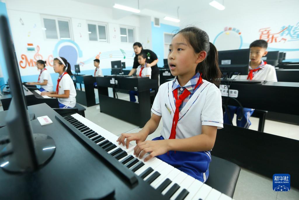 9月7日,山東省青島市即墨區龍山中心小學(xué)的學(xué)生在學(xué)習彈鋼琴。