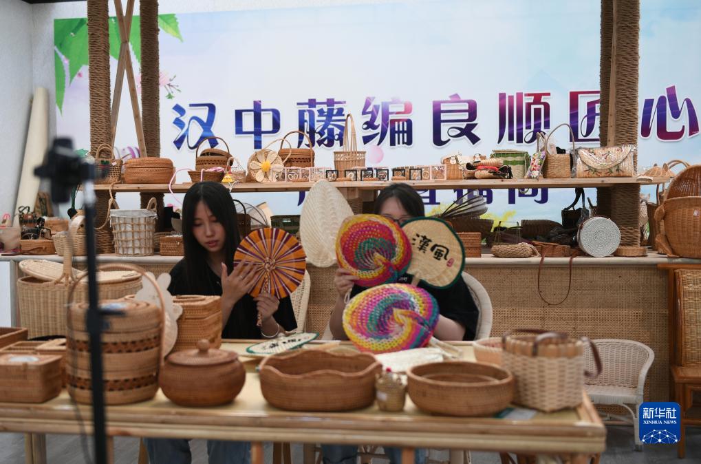 9月7日,在位于漢中市的陜西良順匠心實(shí)業(yè)有限公司,工作人員在直播推薦藤編工藝品。