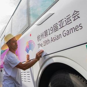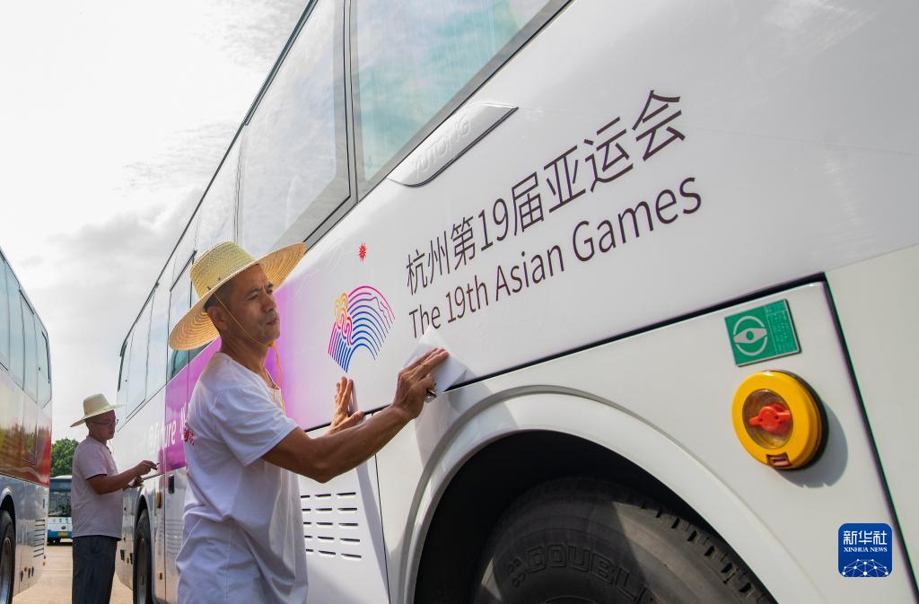 杭州亞運會(huì )臨近,浙江省金華市金華公交集團三公司的工作人員給車(chē)輛貼上亞運主題車(chē)貼,為公交車(chē)換上“亞運新裝”。金華市是杭州亞運會(huì )協(xié)辦城市之一,將承辦足球和藤球比賽。