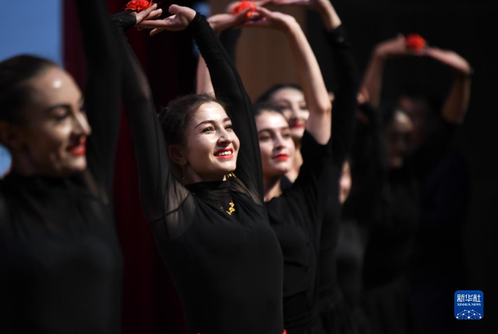 古麗巴努爾·庫爾恰克(左二)和同事們在排練舞蹈節目《花兒為什么這樣紅》(9月4日攝)。