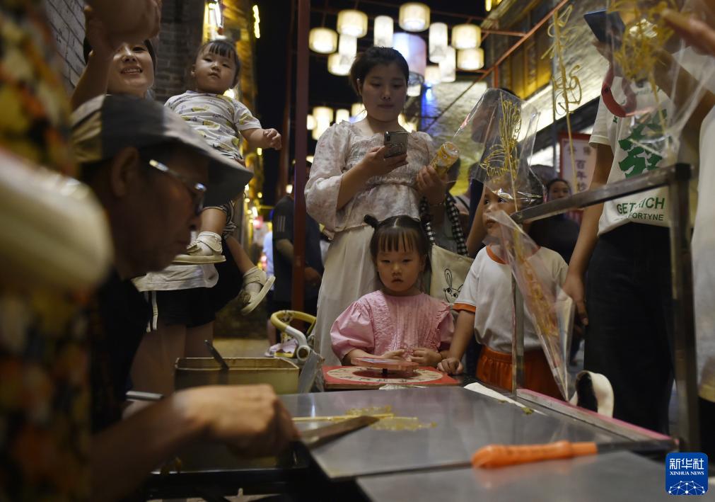 9月7日晚,游人在安陽(yáng)古城縣前街“古韻鎏光·燈火安陽(yáng)”沉浸式夜游活動(dòng)現場(chǎng)選購糖畫(huà)。