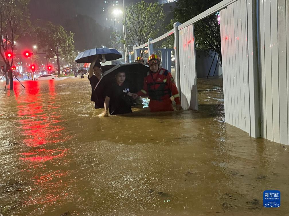 9月7日,深圳市消防救援支隊消防救援人員在深圳市龍崗區愉龍路積水嚴重區域幫助市民轉移。