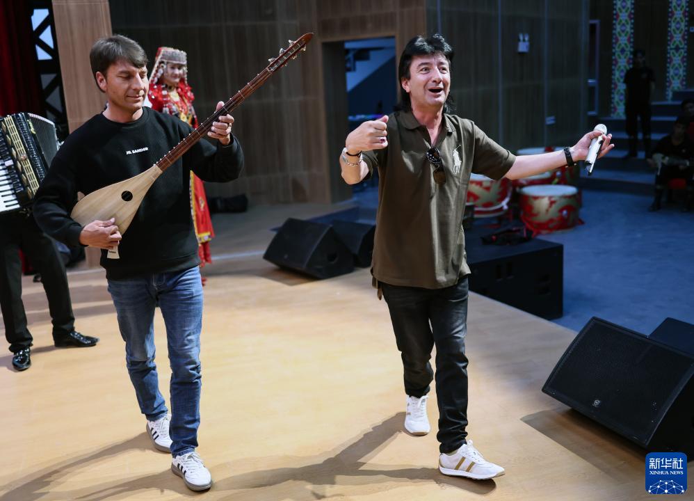 新疆塔縣文化館館長(cháng)艾孜木·胡西迪力(右)指導在彩排的樂(lè )手彈奏樂(lè )器都塔爾(9月4日攝)。新華社記者 蘭紅光 攝