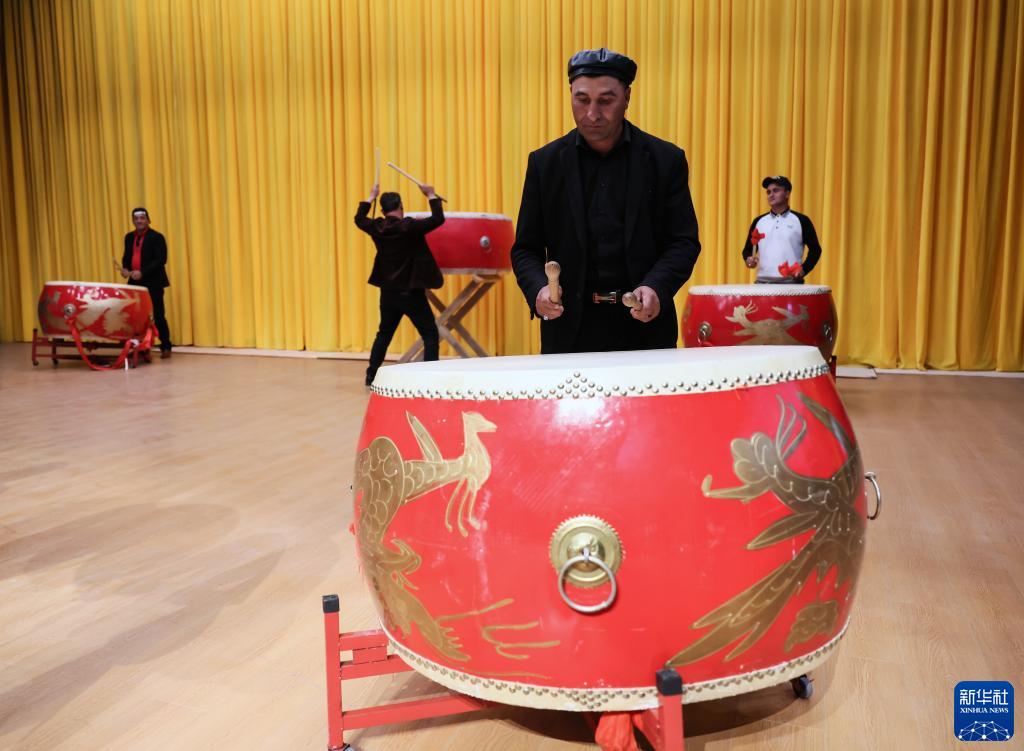新疆塔縣文工團樂(lè )手馬爾達尼·卡比力在排練中打鼓伴奏(9月4日攝)。新華社記者 蘭紅光 攝