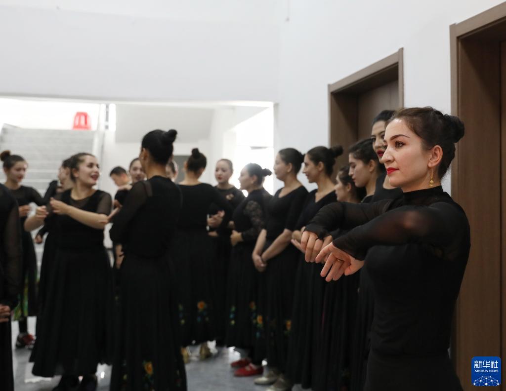 舞蹈演員古麗巴努爾·庫爾恰克(右一)和同伴們在塔縣文化服務(wù)中心劇場(chǎng)后臺等候排練(9月4日攝)。新華社記者 程婷婷 攝